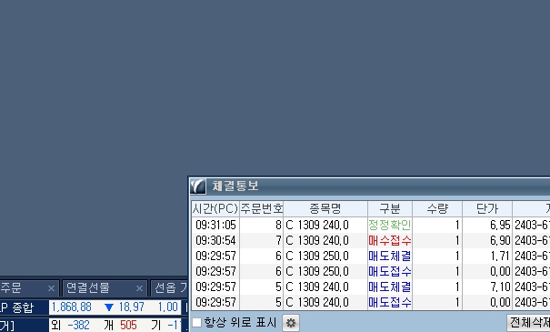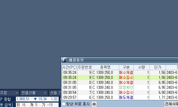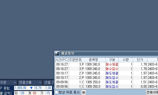 이건 아마 call240 7.0에 매도한 것을 청산하다 보니,시스템은 콜2개매도,풋1개매도가 잇는걸로 인지하는 루틴이 있나봅니다...