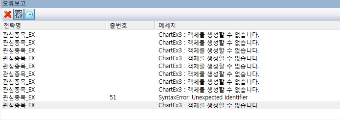 확장차트를 만들고 나서 검증을 누르면 다음과 같이 오류보고 창에 에러메시지가 생깁니다.
