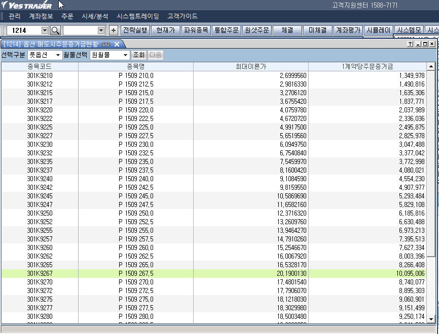 근데, [1214]옵션 매도시 주문증거금현황 화면에서 9월물 풋 267.5의 1계약당 옵션 매도 증거금은 10,095,006원인데, 왜 14,000,000원 가량이나 더 잡히나요?