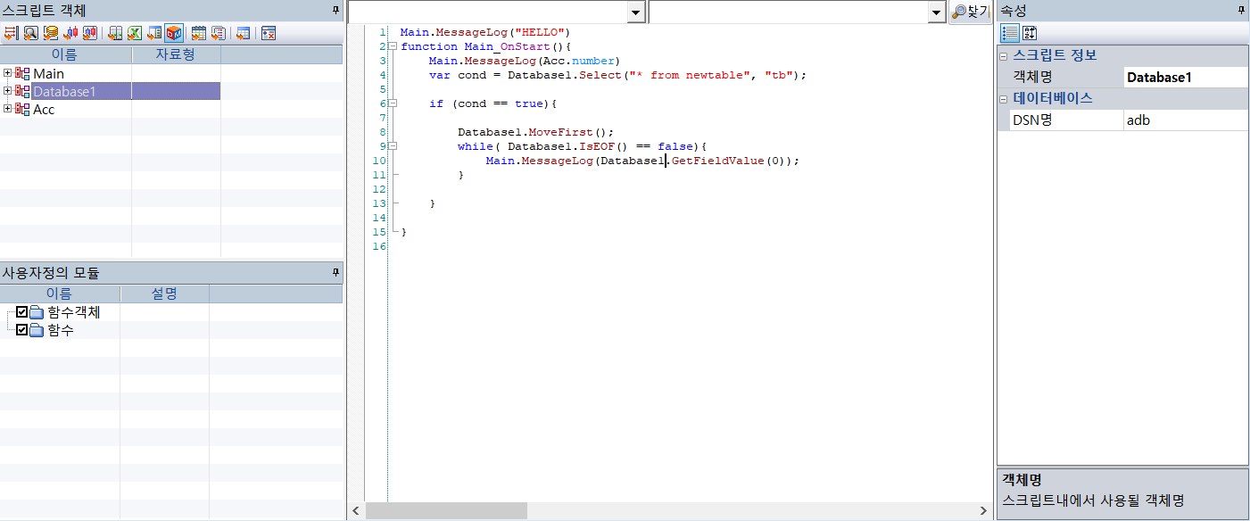 스크립트정보에서 객체명은 'Database1'인데,