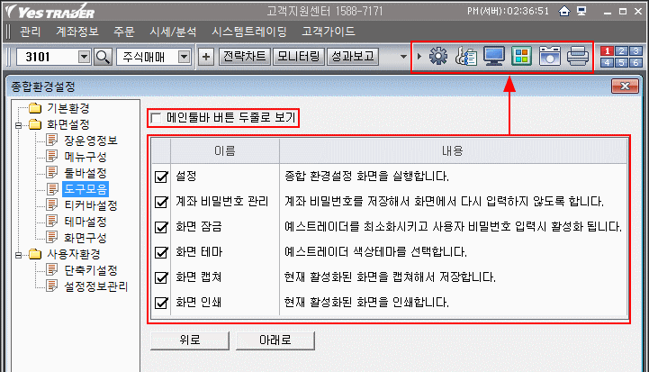 YesTrader의 메인화면의 메인툴바에 나타낼 도구를 선택할 수 있습니다.