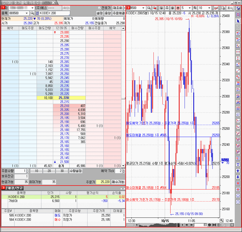 '[2107] 호가클릭 차트주문'은 원샷주문화면에 차트창을 결합한 주문 화면으로 주문의 실행과 주문의 처리 상황을 원샷주문 화면 과 차트화면에서 확인하고 실행할 수 있는 화면입니다. 원샷주문 화면을 통하여 신규 매수 및 매도주문, 정정주문, 취소주문, 예약주문이 가능하며, 원샷주문 화면의 호가 영역이나 주문영역에 마우스를 올려놓으면 해당 가격이 차트에 수평의 선으로 표시되어 차트상 어떤 가격에 주문을 낼지 시각적으로 확인이 가능합니다. 또, 차트 화면에서는 보유종목의 평균단가, 미체결주문 및 예약주문 가격을 수평의 선으로 나타냅니다. 미체결주문과 예약주문은 차트에서 수평의 선을 마우스로 드래그 함으로써정정주문 또는 예약정정이 가능합니다.