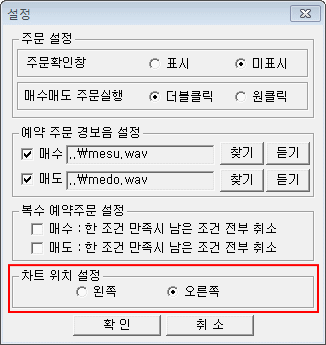 ① 버튼을 클릭하여 설정창을 열고 차트의 위치를 원샷주문 화면의 오른쪽