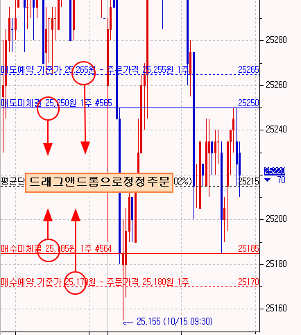 ② 차트에 수평의 선으로 표시된 '매수미체결, 매도미체결, 매수예약, 매도예약'의 선을 마우스로 드래그앤드롭하여 정정주문 또는 예약정정을 할 수 있습니다.