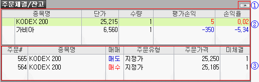 ① 버튼을 클릭하여 주문체결/미체결 영역을 펼치거나 닫을 수
