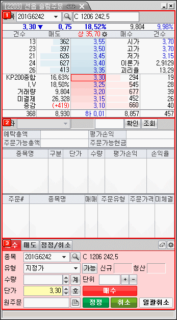 '[2203] 선옵 슬림주문' 화면은 주문화면 기능에 '호가정보, 계좌잔고, 미체결정보' 를 제공하여, 별도의 개별화면 없이 종목의 시세를 조회하고, 주문을 실행한 후 계좌정보의 조회까지 가능하도록 하여주문의 편의성을 높인 주문화면입니다.