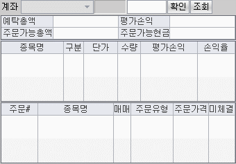 선택하신 종목의 '매수주문, 매도주문, 정정주문, 취소주문' 을 실행시킬 수 있는 영역입니다.