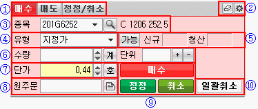 ① 탭을 클릭하여 매수, 매도, 정정/취소 주문을 선택할 수 있습니다.