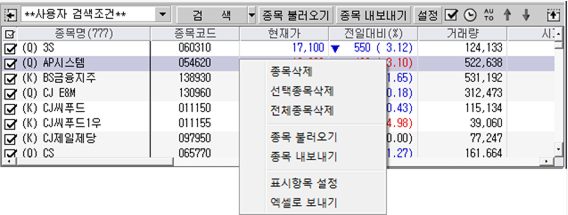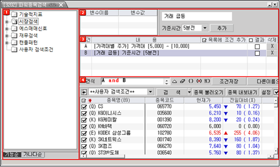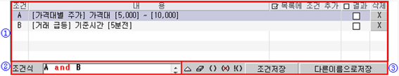 지정한 조건식에 의한 검색 결과를 보여주는 영역입니다. 조건검색의 '검색범위, 주권구분, 제외종목, …' 등 검색에 대한 기본사항들에 대해 설정할 수도 있습니다.
