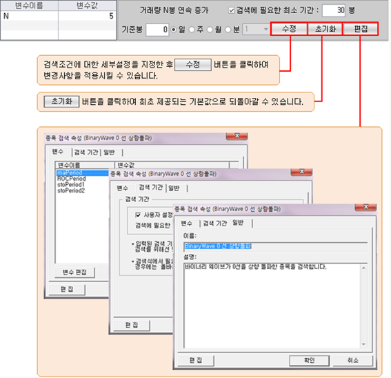 검색조건 리스트에서 선택한 검색조건에 대해 세부 설정을 할 수 있습니다.