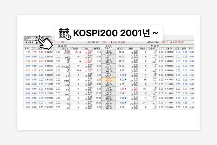 2001년부터의 1분, 일 단위 선물옵션 시세를 제공하여 장기적 관점의 전략 설계와 검증이 가능합니다. 과거 데이터를 활용해 다양한 시장 국면에서 전략의 내구성을 시험할 수 있습니다.