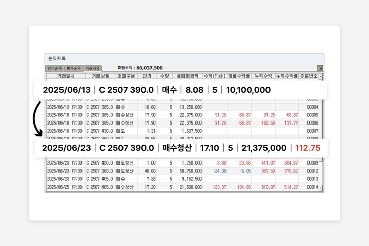 분 단위 민감도 차트, 월물 복기, 시세 기반 리포트를 통해 전략의 취약 구간을 정밀 분석할 수 있습니다. 숨겨진 손익 패턴과 위험 요인을 바르게 찾아내고 전략을 개선할 수 있는 강력한 진단 도구입니다.