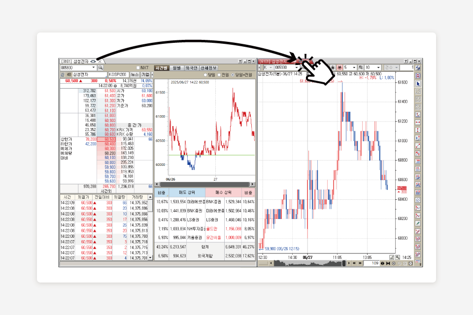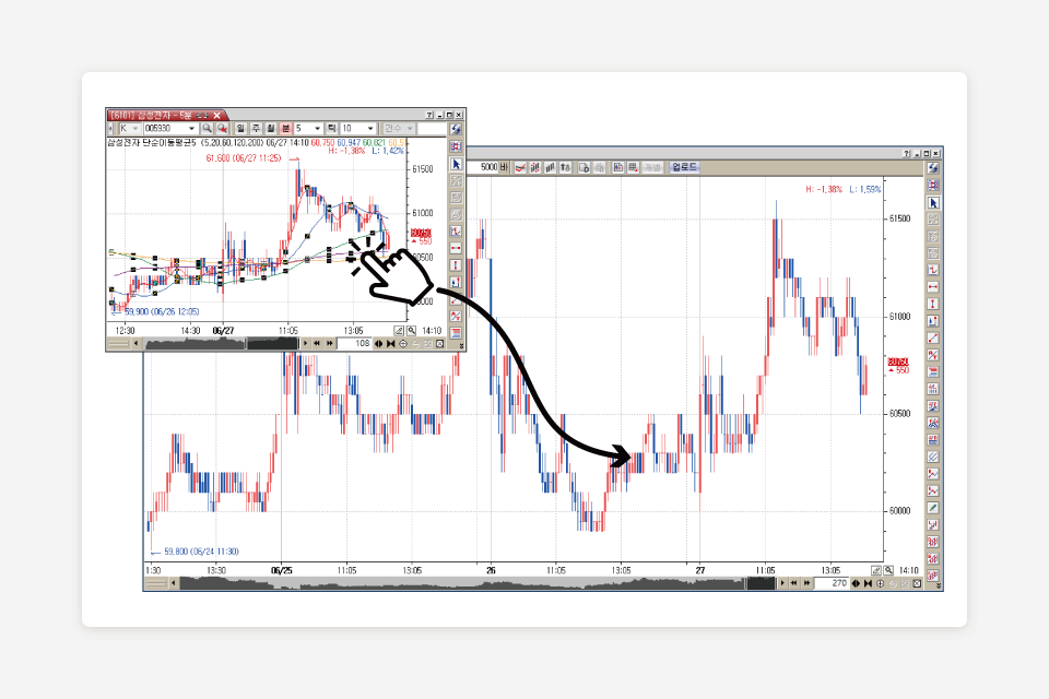 드래그만으로 원하는 구성대로 창을 배치할 수 있어, 나만의 트레이딩 환경을 완성할 수 있습니다.