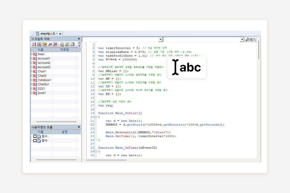 자바스크립트 스타일의 시스템트레이딩 언어를 통해 차트 신호, 주문 체결, 잔고 정보 등 실시간 데이터를 기반으로 전략을 실행하고 자동으로 매매할 수 있는 고급 기능입니다.