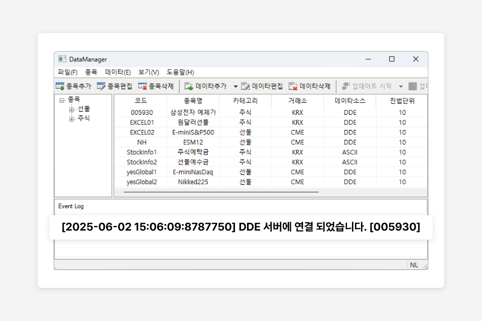 사용자가 보유한 텍스트 데이터나 외부 시세(DDE)를 Data Manager에 저장한 뒤, 차트에 연동하여 고유한 분석 및 전략 설계에 활용할 수 있습니다.